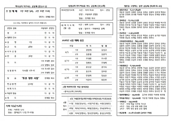 2026.04.12 주보 페이지 정보 문선균집사 메일보내기 아이디로 검색 0 7 23시간 36분전 첨부파일 04.12002.jpg (622.1K) 1 2026-04-11 20:12:40 04.12001.jpg (916.3K) 0 2026-04-11 20:12:40 짧은주소 Short URL : http://www.daeeunch.com/community/bbs/?t=iy 주소복사 × 짧은 글주소 복사 Note! 위 주소를 클릭 후, 복사(Ctrl+C)하여 사용하세요. 다음글 목록 본문 댓글목록 등록된 댓글이 없습니다.